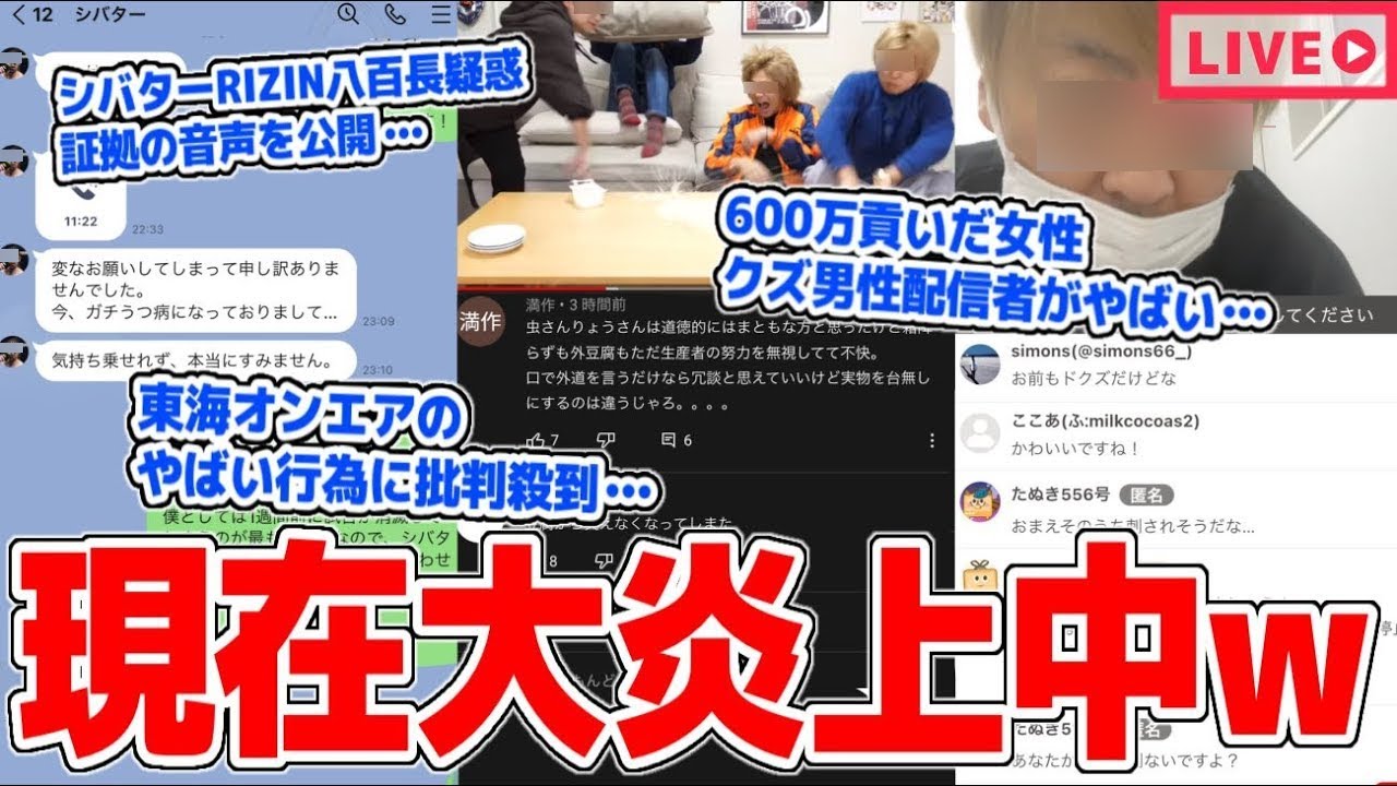 【緊急生放送】シバターRIZIN八百長疑惑…証拠の音声を公開…東海オンエアがやばい行為で批判殺到…600万円貢いだ女性とクズ配信者のトラブルがやばい…セブンイレブン賞味期限切れおでん動画を店員が告発